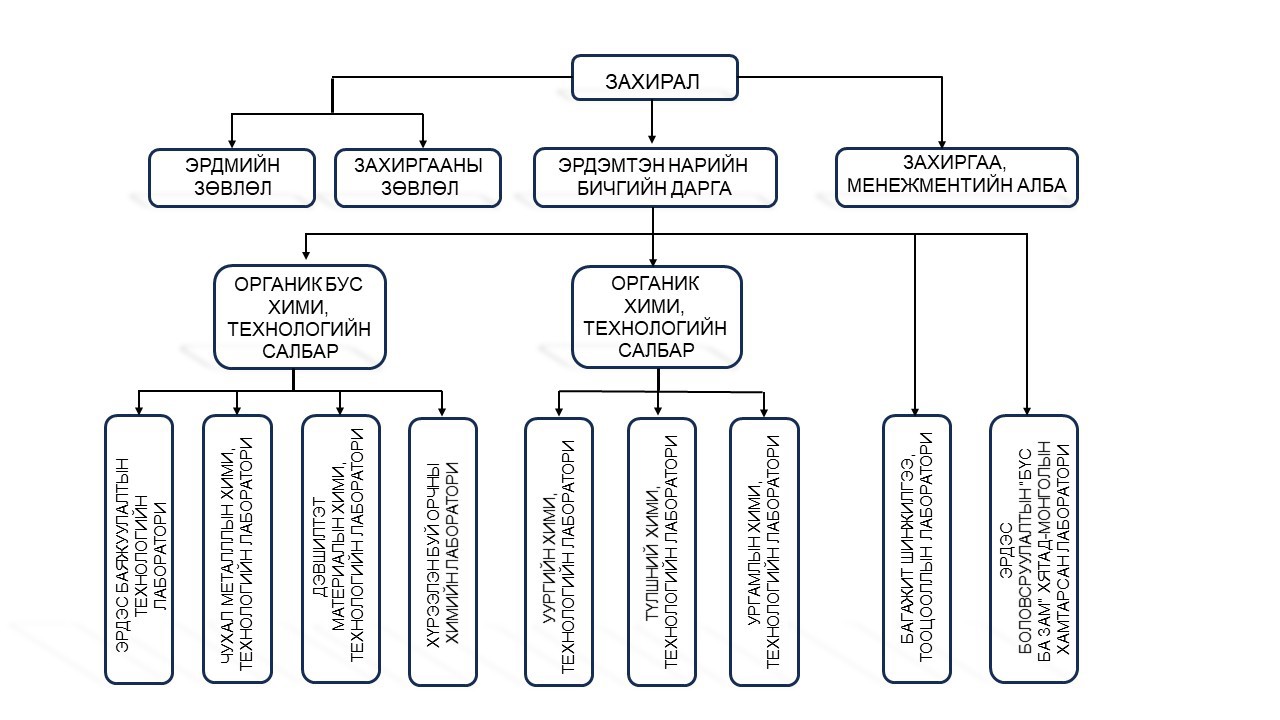 Хими, химийн технологийн хүрээлэн нь органик бус хими ба органик химийн хоёр салбарт харъяалагдах эрдэм шинжилгээний үндсэн 7 лаборатори, багажит шинжилгээ тоцоололын лаборатори, Эрдэс боловсруулалтын “бүс ба зам” хятад-монголын хамтарсан лаборатори болон захиргаа менежментийн алба гэсэн нийт 10 нэгжтэйгээр байгалийн нэгдлийн хими, биохими, материал судлал, органик биш хими, органик хими, нүүрсний хими-технологи, хүнсний хим экологи хими, эрдэсийн баяжуулалтын болон шинэ технологи зүгшрүүлэх, нутагшуулах чиглэлээр судалгаа, туршилтын ажил хийж гүйцэтгэж байна.